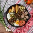 690 г • Картофель, яйцо, домашняя колбаса, грибы шампиньоны, шкварки, помидор, огурец маринованный, лук, зелень